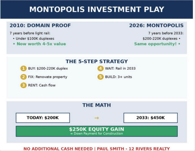 ✅ Montopolis Investment Opportunity - Buy duplexes NOW at $200-220K, projected $450K value in 6 years when light rail delivers; equity becomes your construction loan down payment