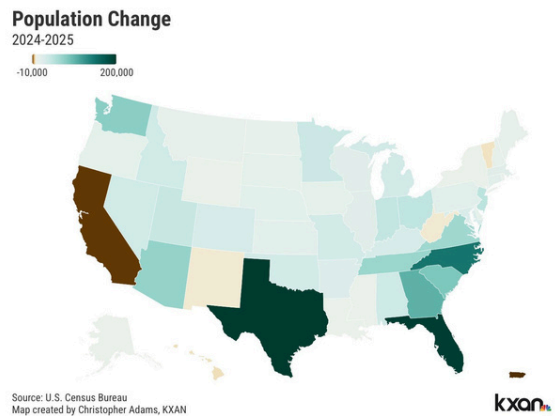 Texas Population Data (July 1, 2025) U.S. Census Bureau Vintage 2025 Population Estimates released January 27, 2026; Texas: 31,709,821; California: 39.3+ million; KXAN Austin; Houston Public Media